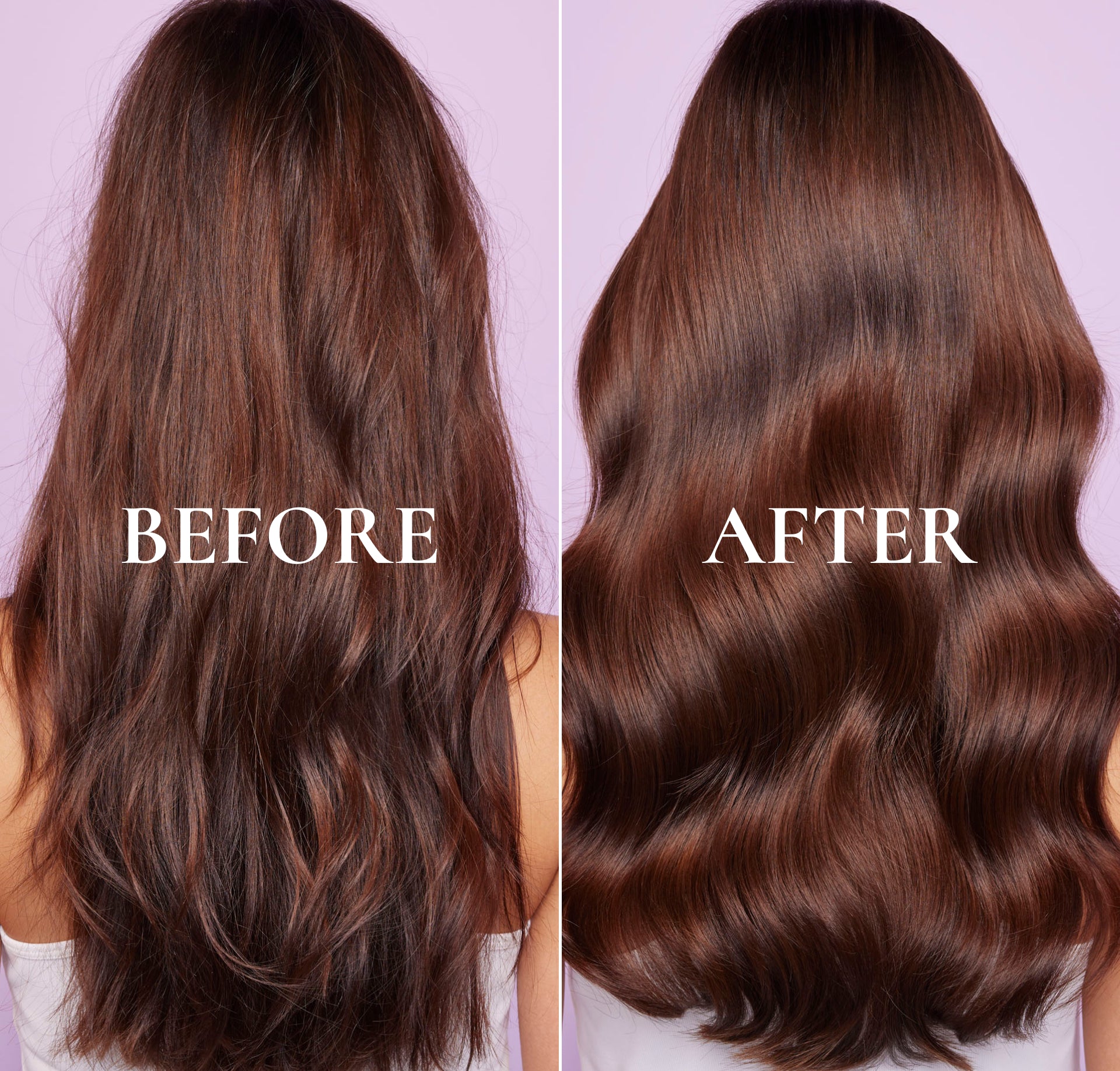 Before/after: Results after application of the High Shine Shampoo, Intensive Repair Hair Mask, Detangling Leave-In Hair Milk.