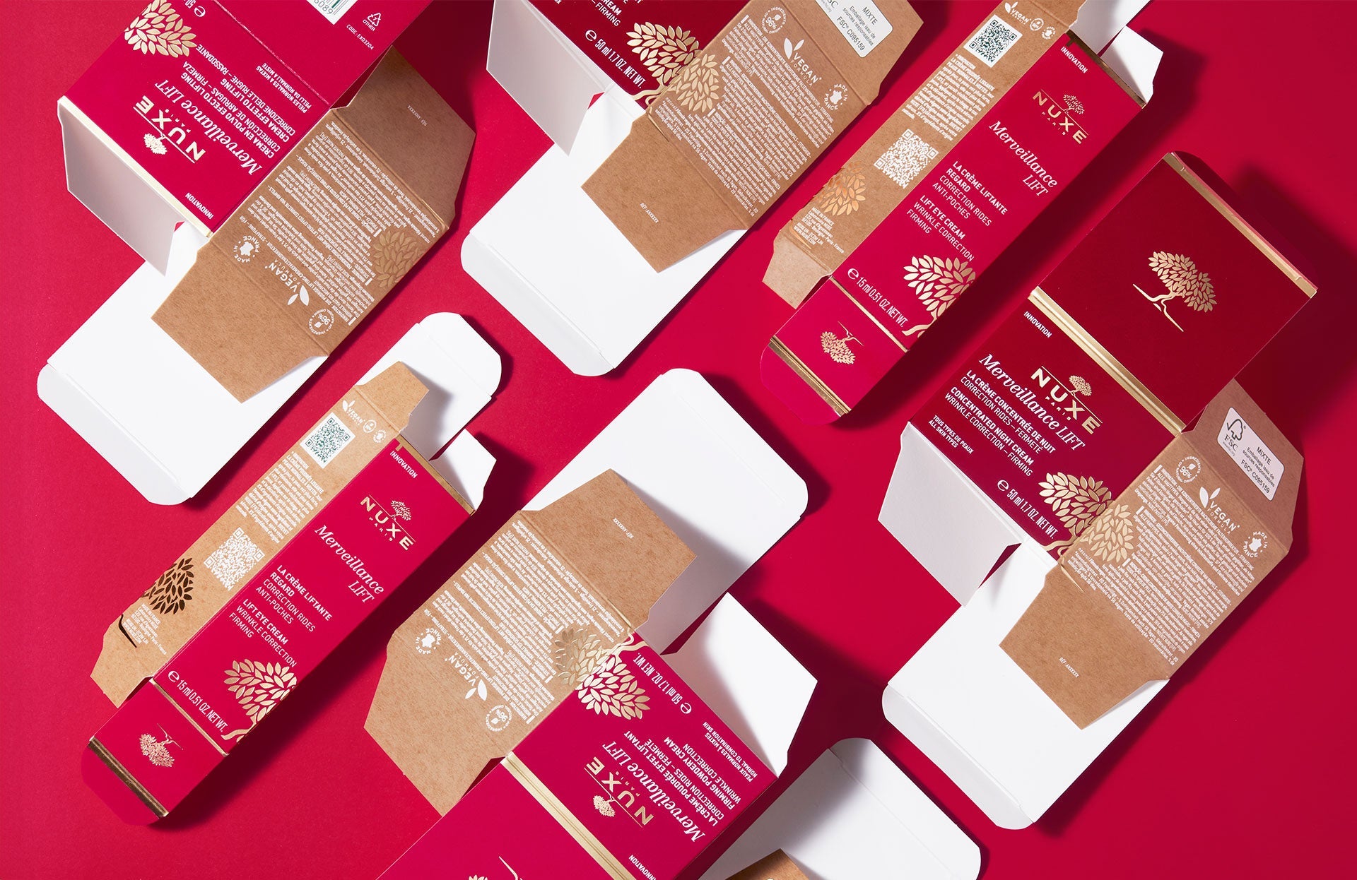 For several years, NUXE has committed to an approach designed to improve its packaging. For Merveillance LIFT, we have created recyclable packaging⁽³⁾ while reducing our use of plastic by 35%⁽⁴⁾ and cardboard by 22%⁽⁵⁾.This represents a 40% reduction in the carbon footprint of our Merveillance LIFT packaging, the equivalent of 87 Paris-New York flights⁽⁶⁾.