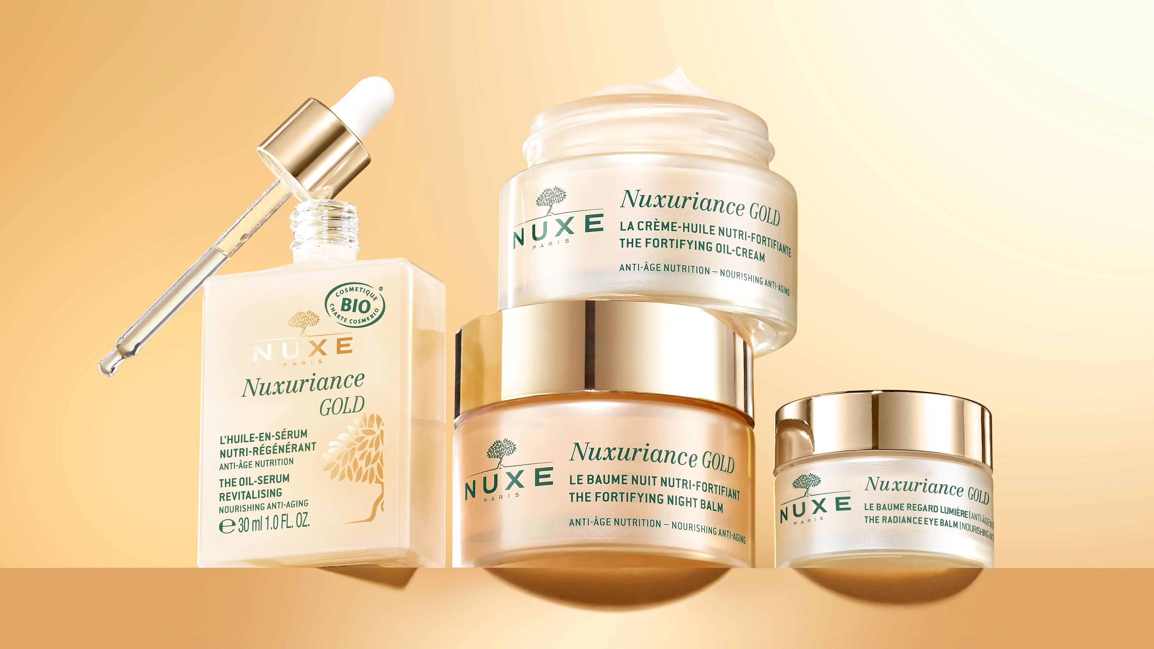 luminous skin with the Nuxuriance Gold care range. The products’ powerful active ingredients are tailored to the specific needs of undernourished mature skin with formulas containing Saffron and Bougainvillea Bi-Floral Cells and Oléoactif of Porcelain Rose⁽¹⁾. Day after day, they diffuse their nourishing and radiance anti-aging power for skin that is full of life.