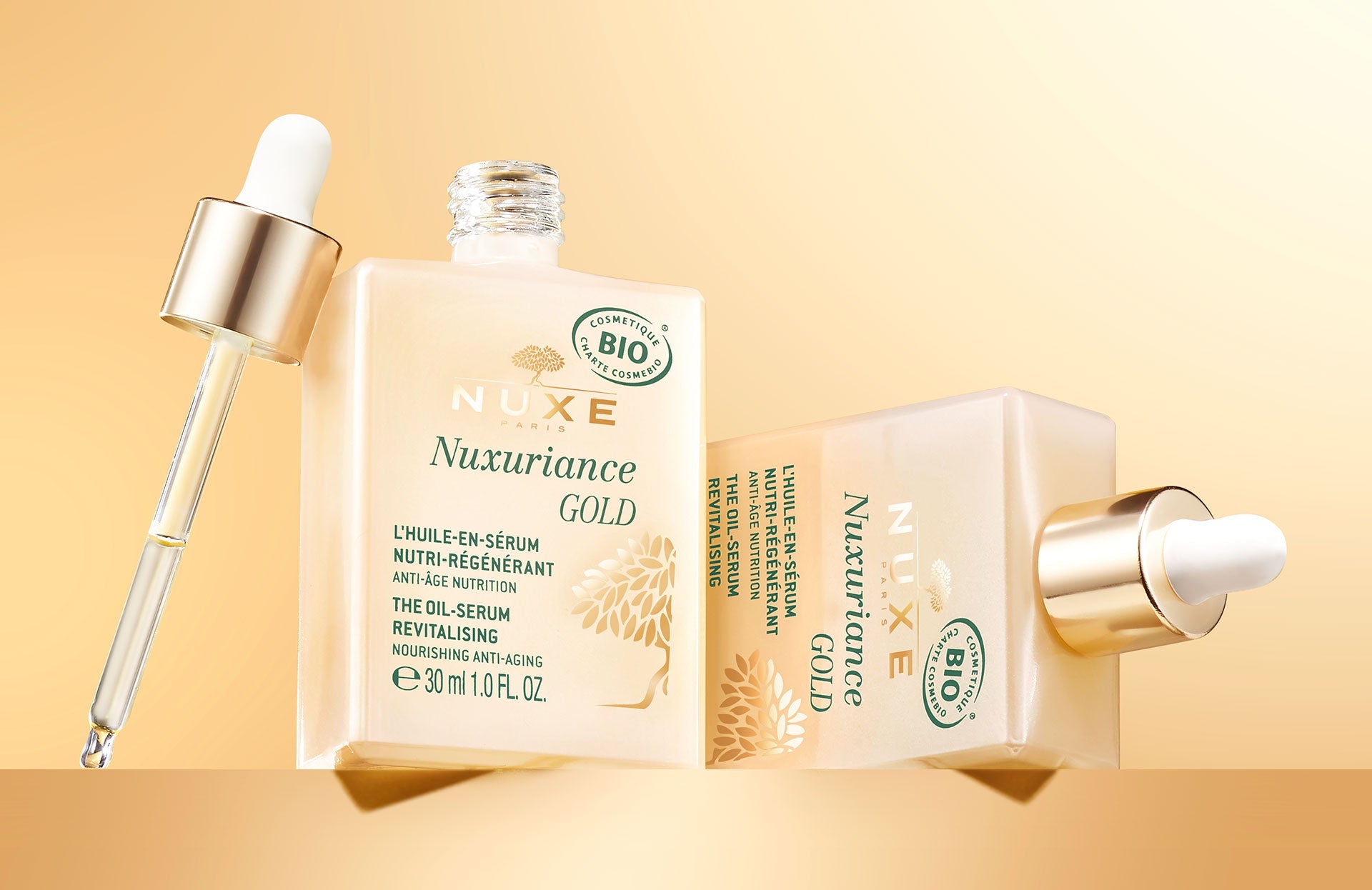 NUXE is committing to respect the environment by reducing the packaging for the Nuxuriance Gold range. The use of plastic has been reduced by 45% and use of cardboard by 25%⁽³⁾. The quantities of CO2 saved are equivalent to the emissions generated by a car journey of 199,793 km⁽⁴⁾ or a flight of 189,046 km⁽⁴⁾.
